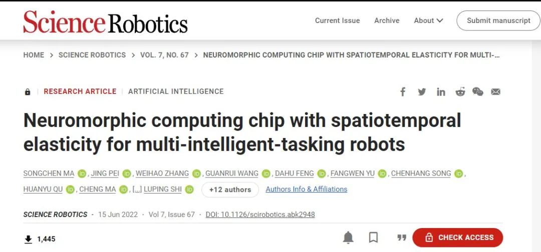 论文标题:Neuromorphic computing chip with spatiotemporal elasticity for multi-intelligent-tasking robots